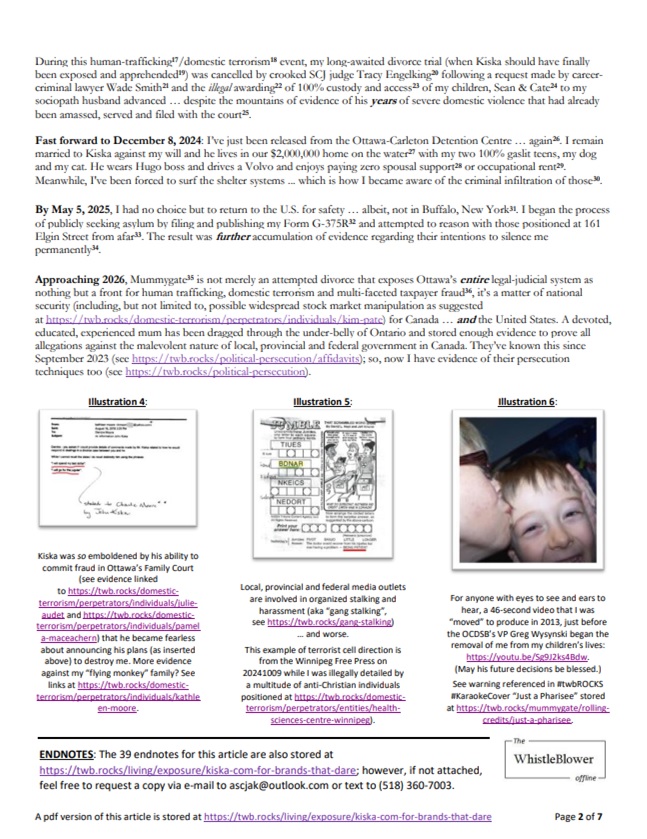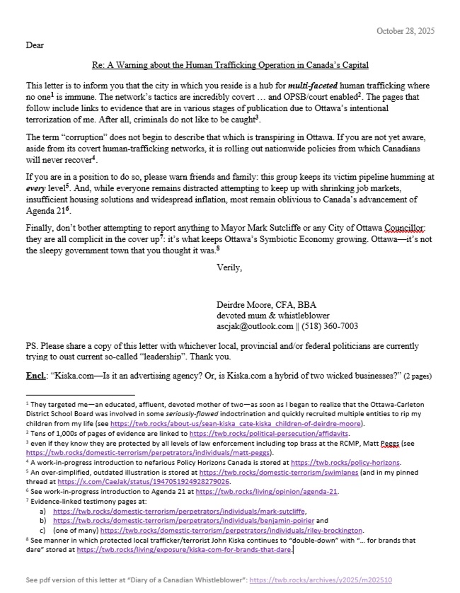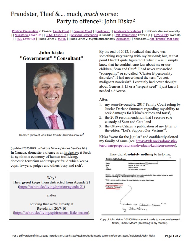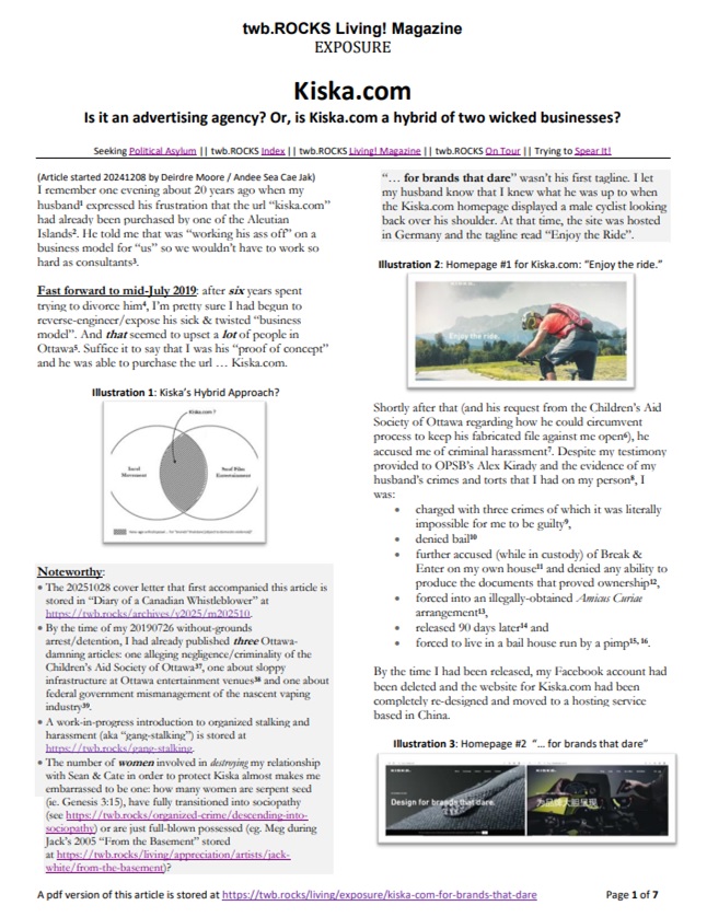 28-Oct-25 Completed Autumn 2025 #MailCampaign cover letter (https://twb.rocks/wp-content/uploads/2025/10/20251028-Mail-Campaign-Cover-Letter-Dear-Ottawa-Recipient-20251028-FINAL_Deirdre-Moore-Sean-Kiska-Cate-Kiska.pdf) and 2-page article with 39 evidence-linked endnotes (https://twb.rocks/wp-content/uploads/2025/10/Exposure_Kiska.com-for-brands-that-dare-as-of-20251028-FINAL_Deirdre-Moore-Sean-Kiska-Cate-Kiska.pdf) re: Kiska.com “… for brands that dare”.
