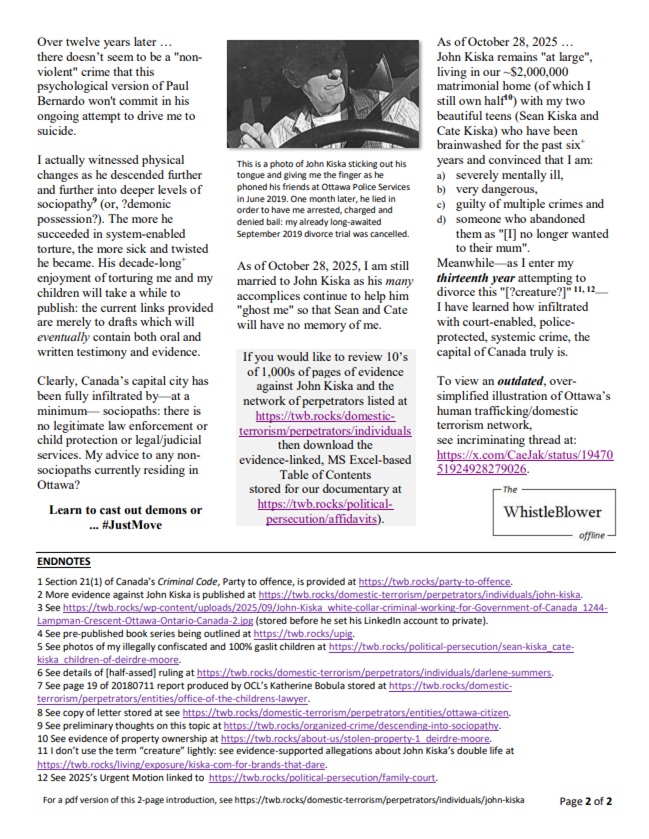 - 2-page introduction to John Kiska (https://twb.rocks/wp-content/uploads/2025/10/20251028-Mail-Campaign-insert-Perpetrator-John-Kiska-FINAL_Deirdre-Moore-Sean-Kiska-Cate-Kiska.pdf) that will be included as an insert for part of my current mail campaign.