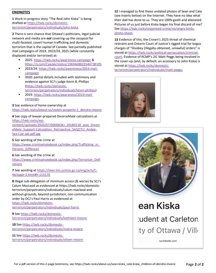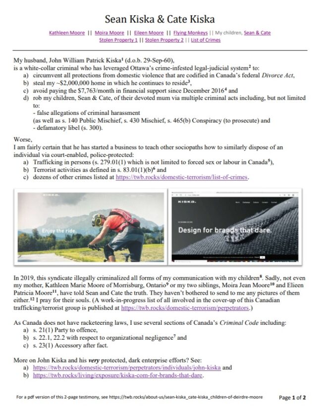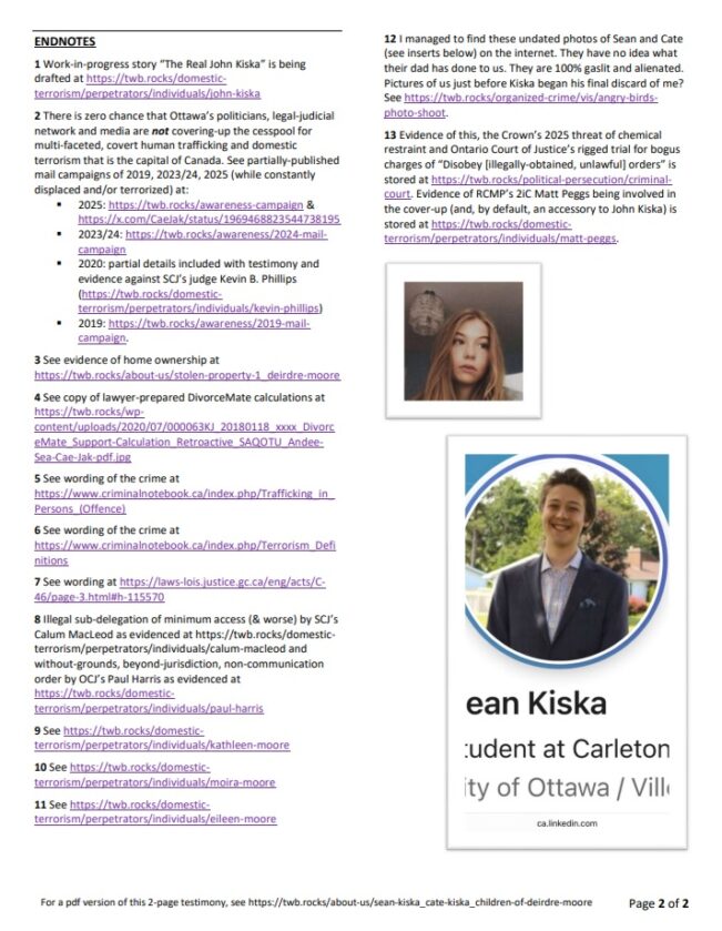 - 2-page testimony regarding the illegal confiscation of my children, Sean and Cate (https://twb.rocks/wp-content/uploads/2025/10/20251028-Mail-Campaign-insert-Sean-Kiska-and-Cate-Kiska-illegally-denied-mum-Deirdre-Moore-FINAL.pdf) that will also be included.