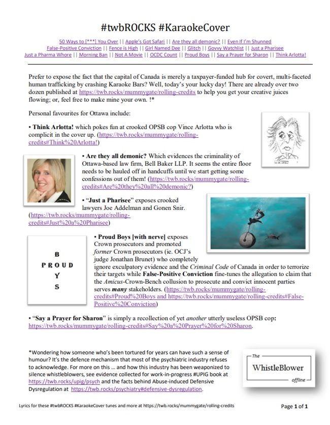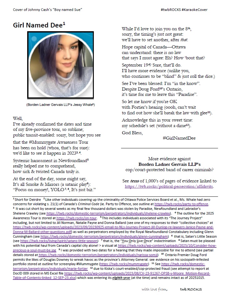 15-Oct-25 Completed publication of two more evidence-linked #twbROCKS #KaraokeCover tunes: (1) Girl Named Dee and (2) Say a Prayer for Sharon (both stored at https://twb.rocks/mummygate/rolling-credits). As I re-purchased some podcast gear (my previous set was effectively stolen when my storage unit was emptied during the Winnipeg-based kidnapping evidenced at https://twb.rocks/domestic-terrorism/perpetrators/entities/health-sciences-centre-winnipeg), I can start re-recording any time. I wonder if USCIS has ever received 60-minute musical testimony to describe Canada’s political and religious persecution techniques. Lots still to do to meet my goals for October.