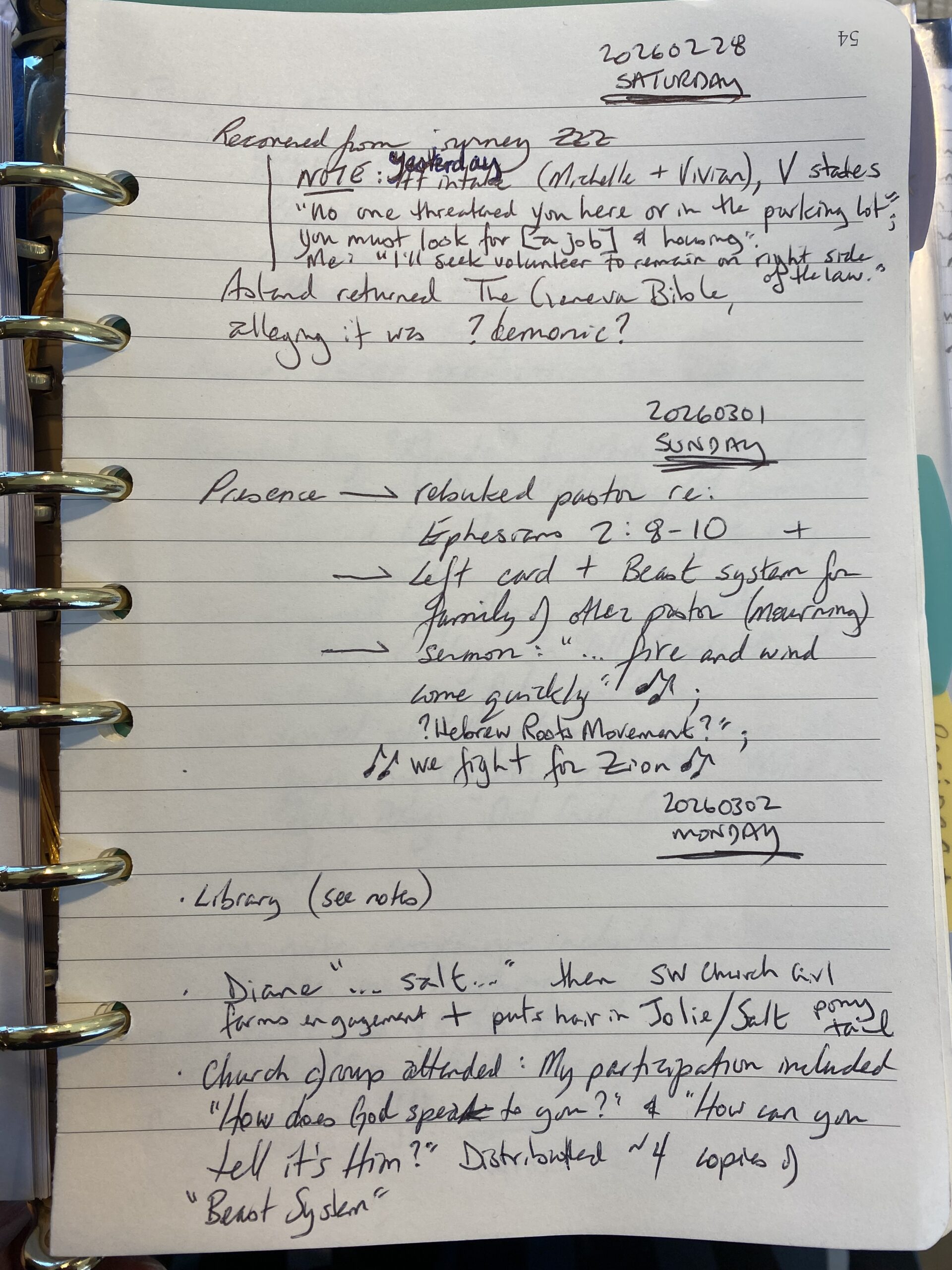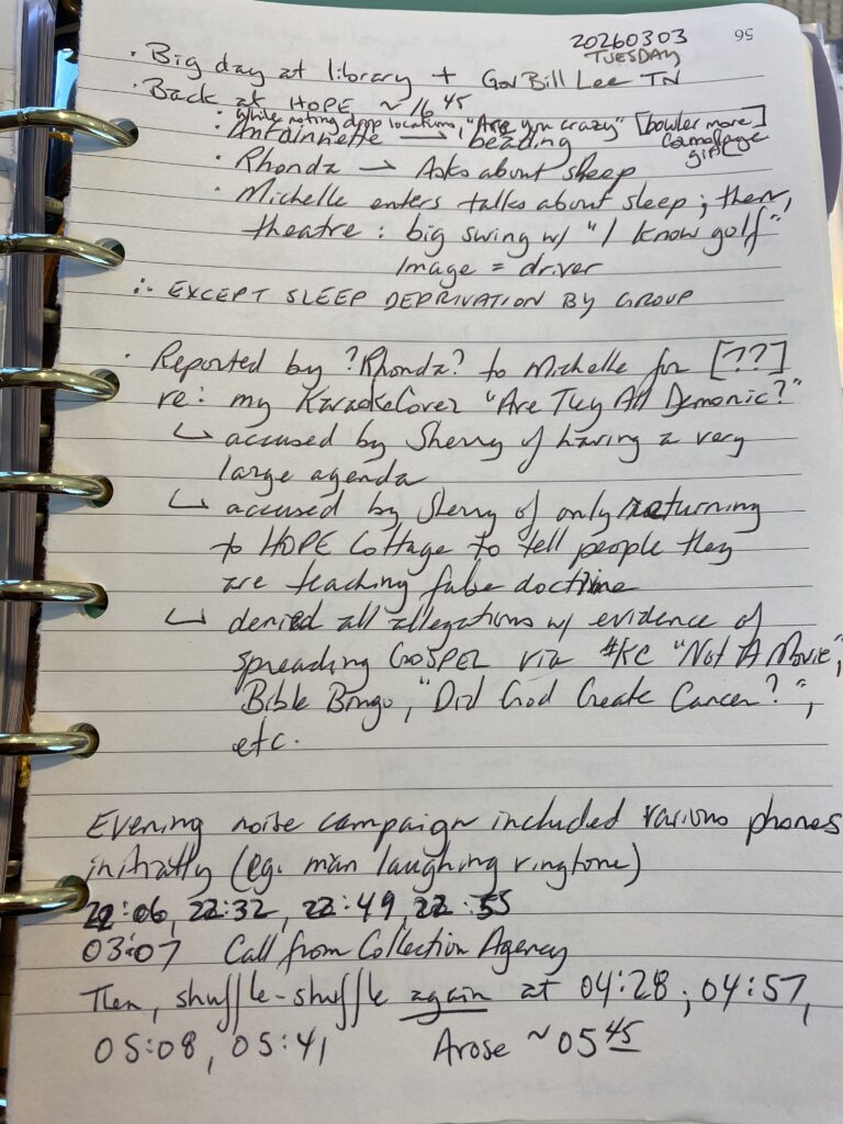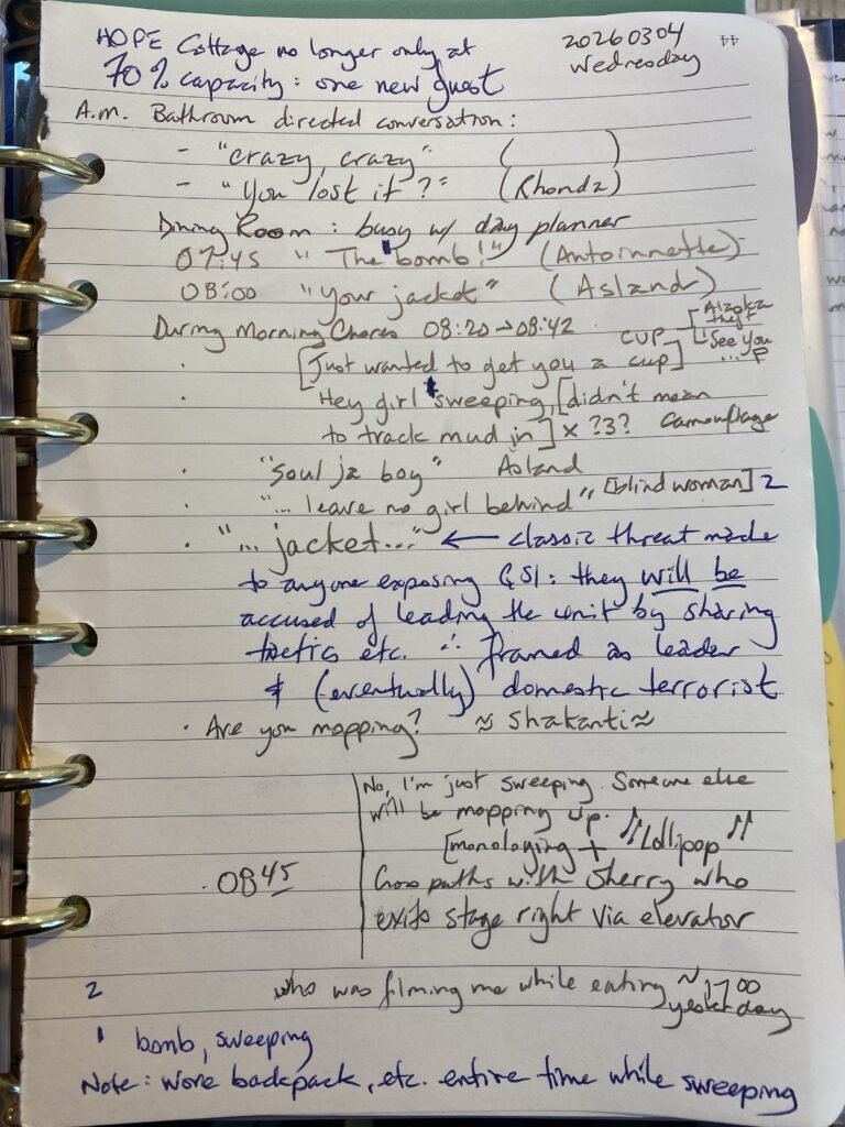 20260304 Event #2 (Not recorded) Told by HOPE Cottage staff Kristen that I was no longer permitted to “read any of my written material”