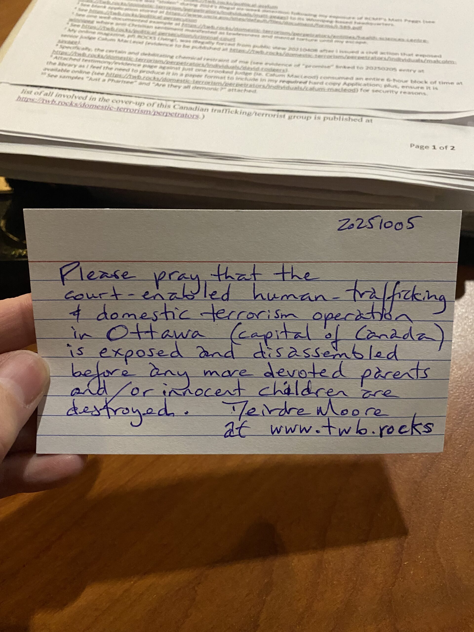 20251003 I published my 30-article project for our twbROCKS Awareness 2025 Tour (see https://twb.rocks/on-tour) and- 20251005 I provided a prayer to a group of church ladies who attended my new secure shelter: the woman promised that the prayer would be read by a large group of people at her church. (As I had already heard that Flagstaff was also a hub for human trafficking; and, that it was run by the Eastern Star, I simply couldn’t resist.)