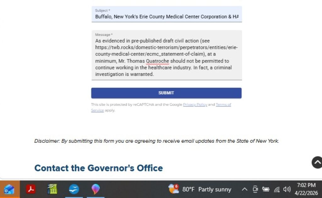 [13] Exposure of Erie County Medical Center Corporation, multiple lawyers, multiple doctors and nurses; and, two “Supreme” Court judges is stored at https://twb.rocks/living/exposure/ecmc. Note that its CEO, Thomas Quatroche (see specific evidence-linked testimony at https://twb.rocks/living/exposure/ecmcc/thomas-quatroche), has just been given a huge promotion and is headed to the Healthcare Association of New York State soon (see article at https://www.hanys.org/newsroom/stories/?a=vs&s=Thomas_J_Quatroche_Jr_PhD_Named_Next_HANYS_President_and_CEO); so, maybe just don’t get injured in New York at all? If nothing else, please avoid Mr. Quatroche (see image 00x).