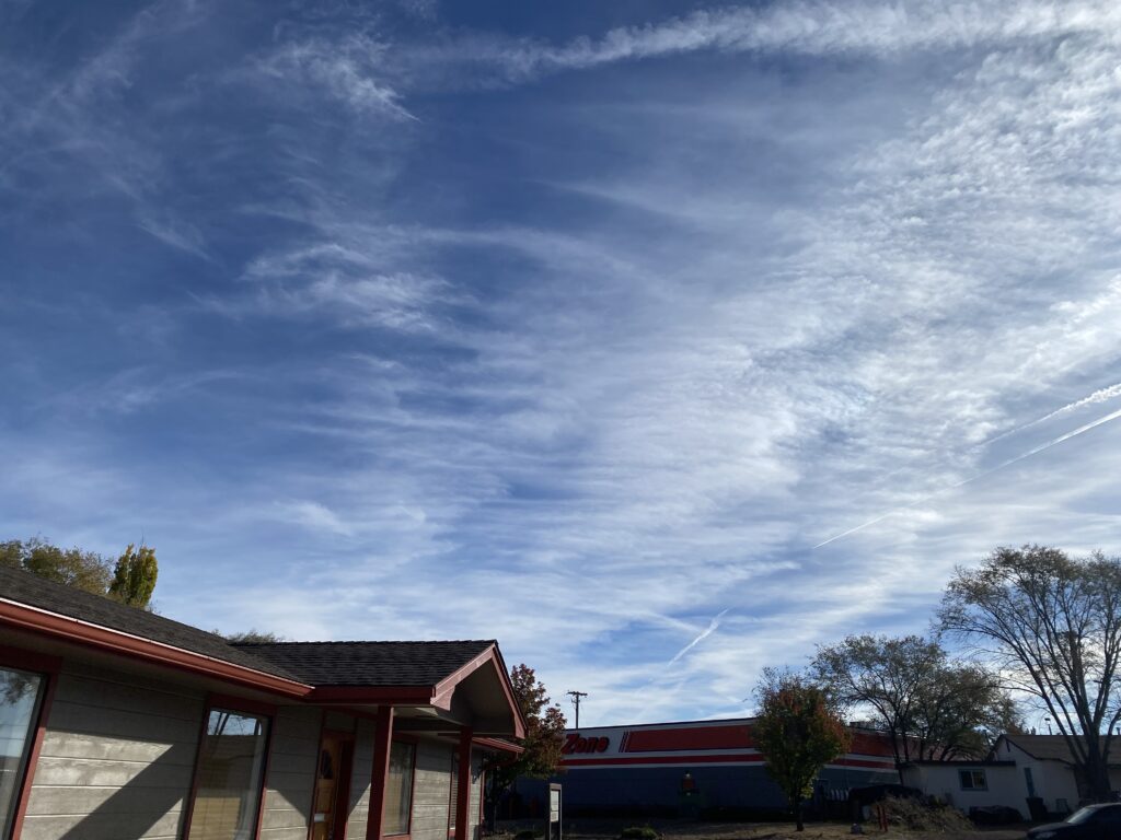 Photograph of chemtrails; some fresh, some dissipating by mid-afternoon || anonymous provider, unknown location.