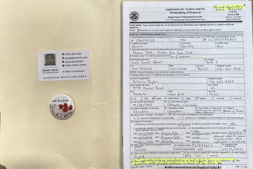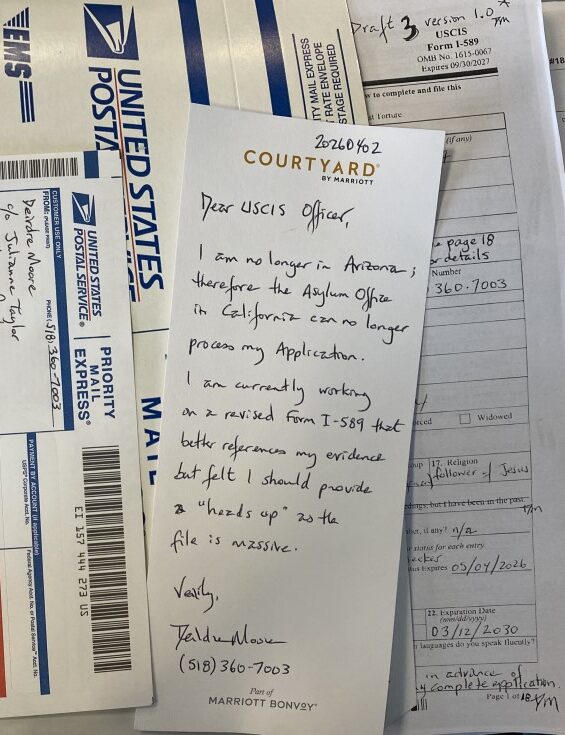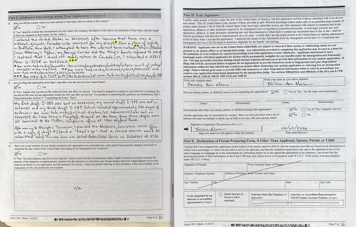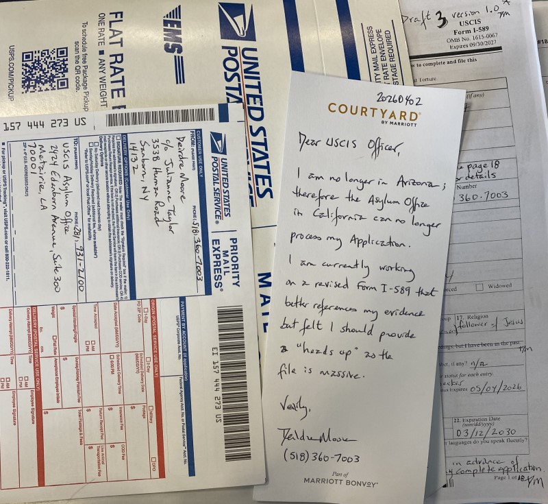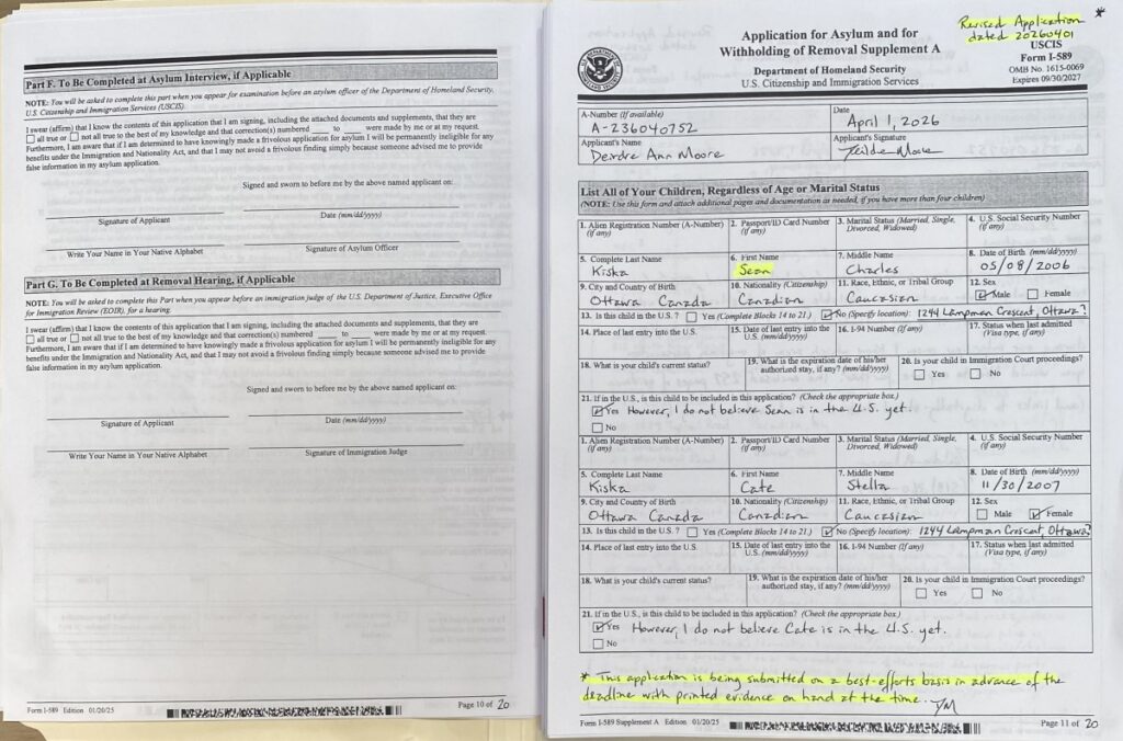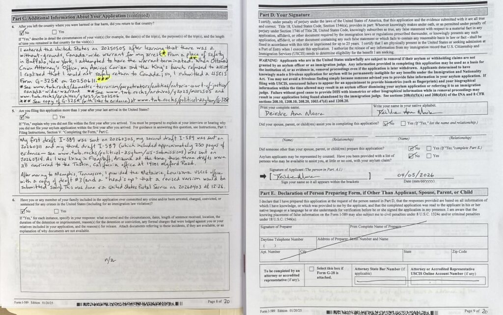 - To Tampa, Florida couriered on 20260417 was significantly improved Form I-589 (see images 18 – 7); and, a better partial Table of Contents that was sent to Louisiana. See scan of fresh, amended pages 1-18 at INSERT LINK. The rest of the submission remained as that which was filed for Tustin, California #3: