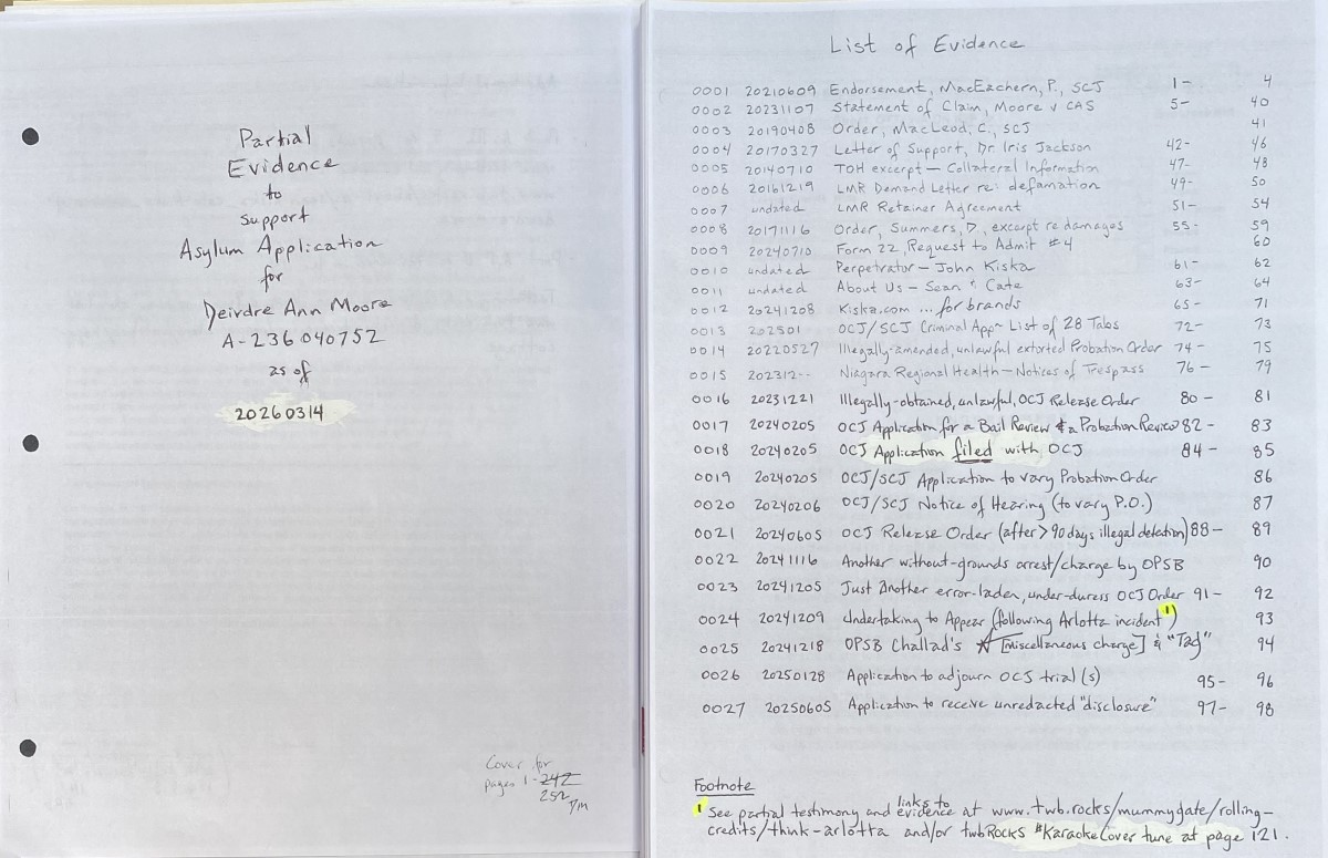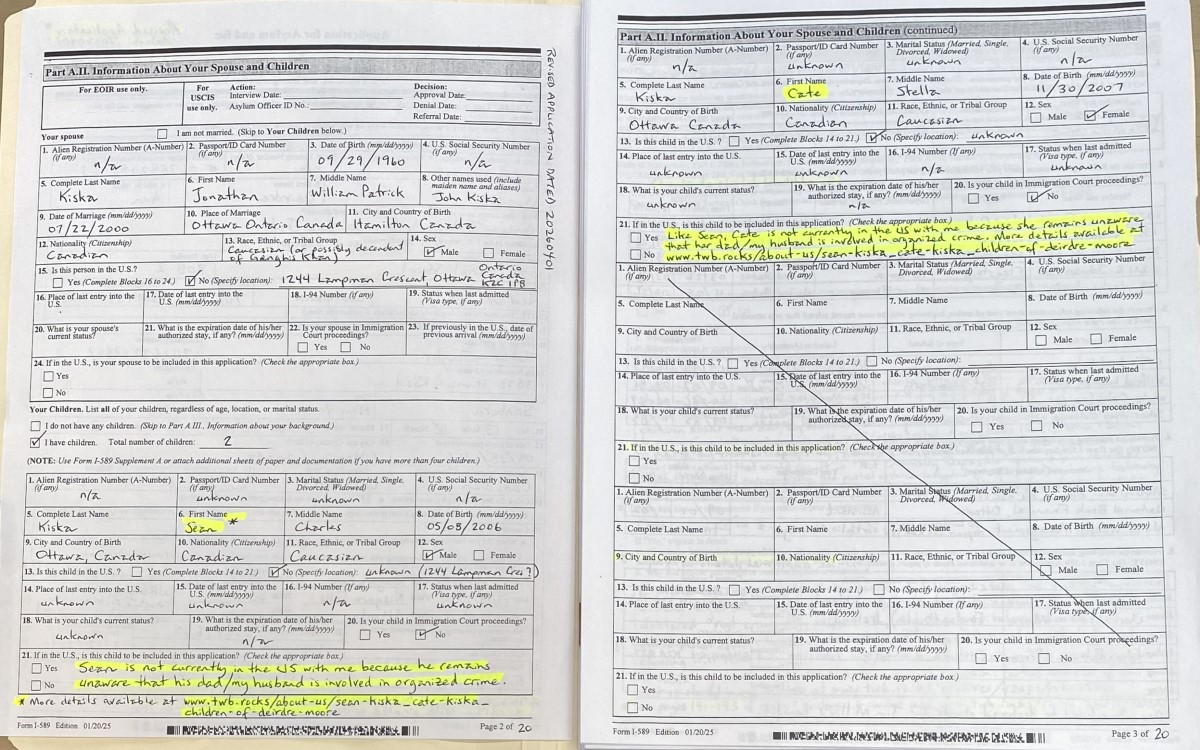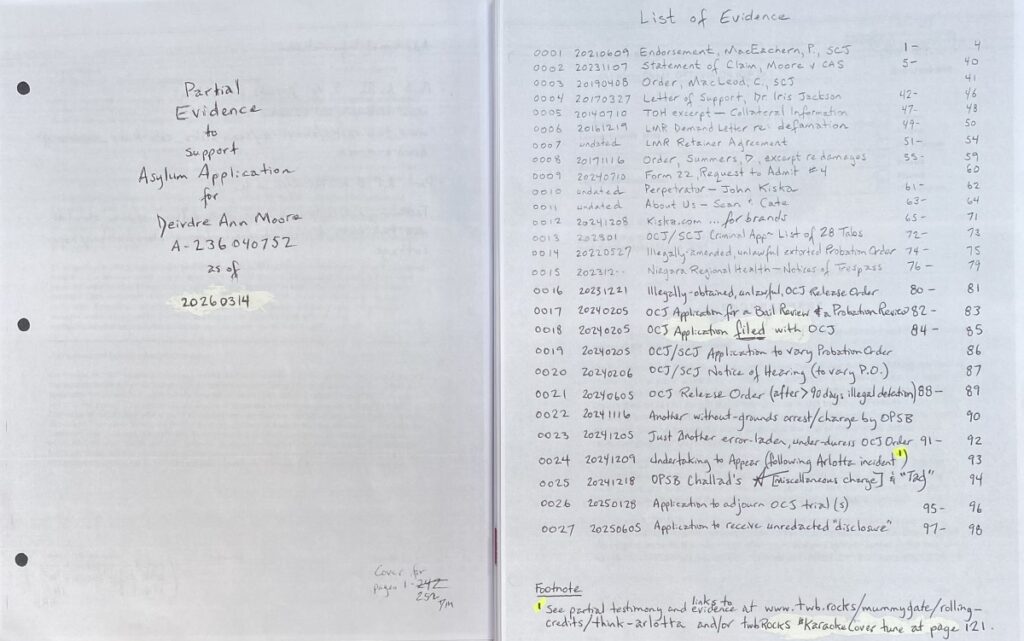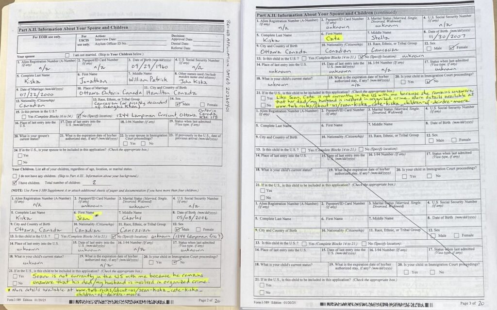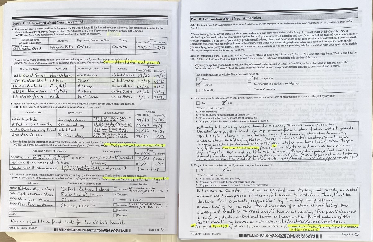 - To Tampa, Florida couriered on 20260417 was significantly improved Form I-589 (see images 18 – 7); and, a better partial Table of Contents that was sent to Louisiana. See scan of fresh, amended pages 1-18 at INSERT LINK. The rest of the submission remained as that which was filed for Tustin, California #3: