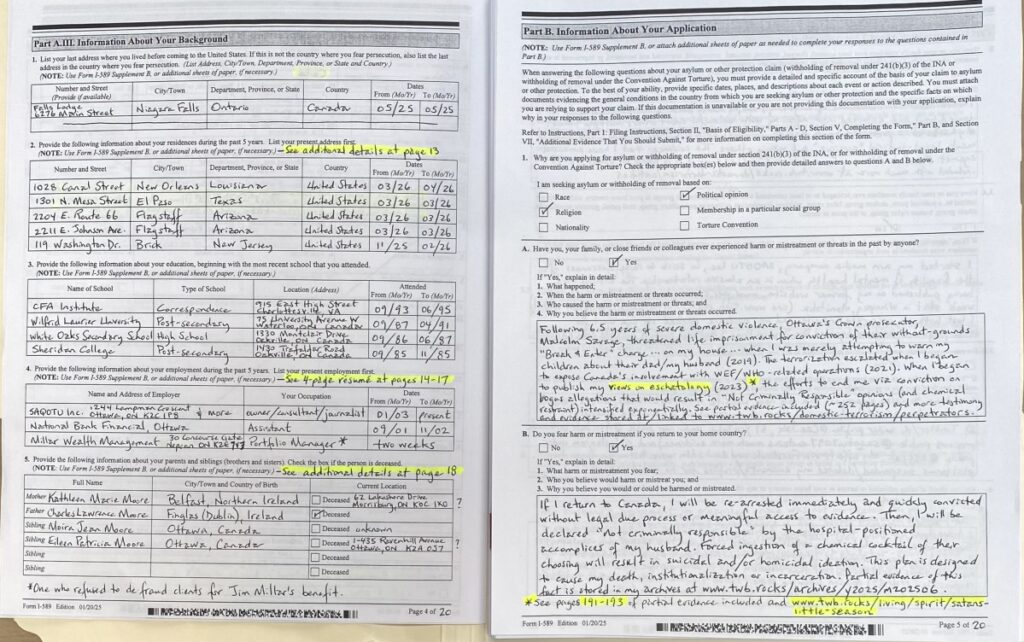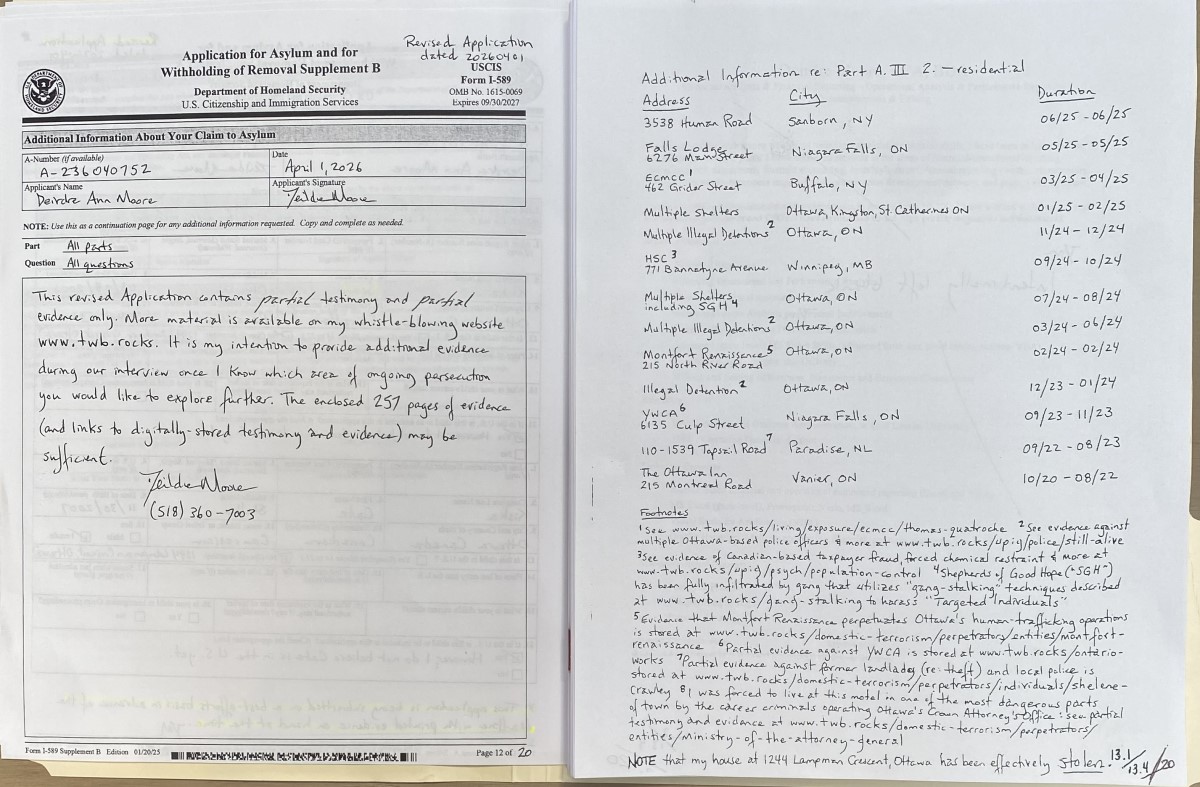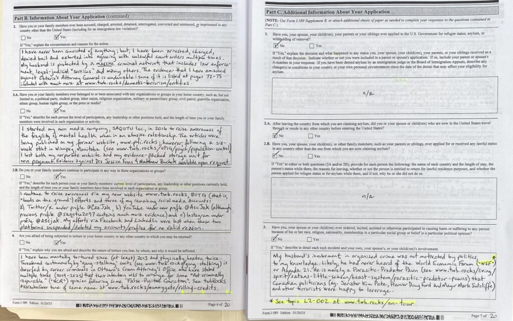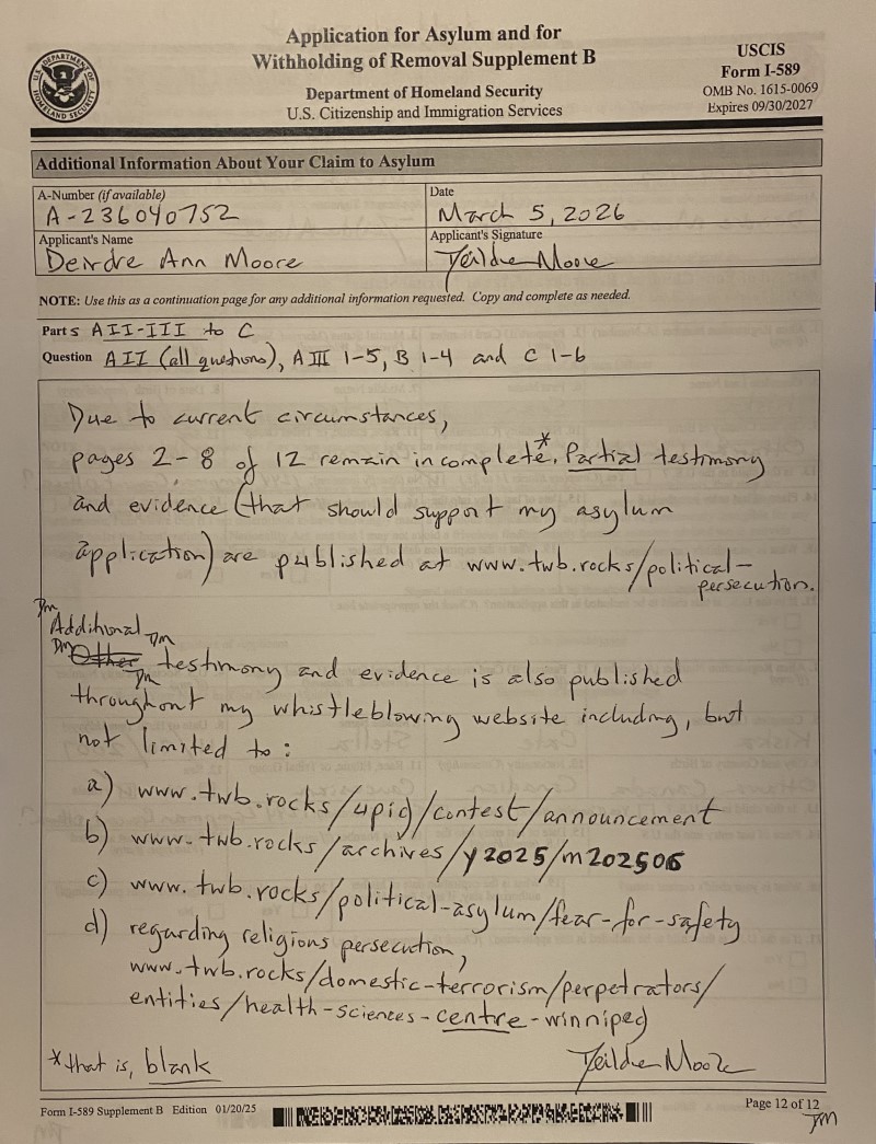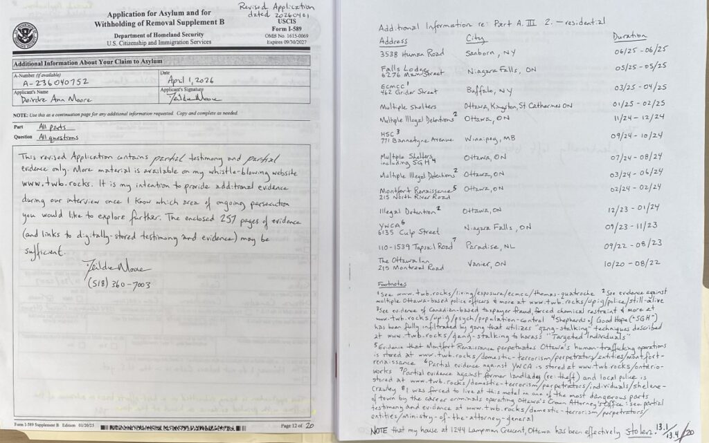 Submitting a complete application is not an easy task as I am a Targeted Individual (“TI”) who is swarmed and/or threatened continuously by gang-stalking cells (see primer on gang-stalking at https://twb.rocks/gang-stalking and some recent testimony and evidence at https://twb.rocks/hostiles). Well aware of this reality, my approach has been to begin submitting my U.S. Asylum Application on a “best-efforts” basis in advance of the 12-month deadline (ie. May 5, 2027). Versions that have been filed to date are: