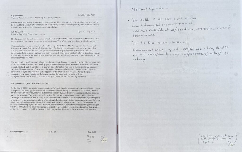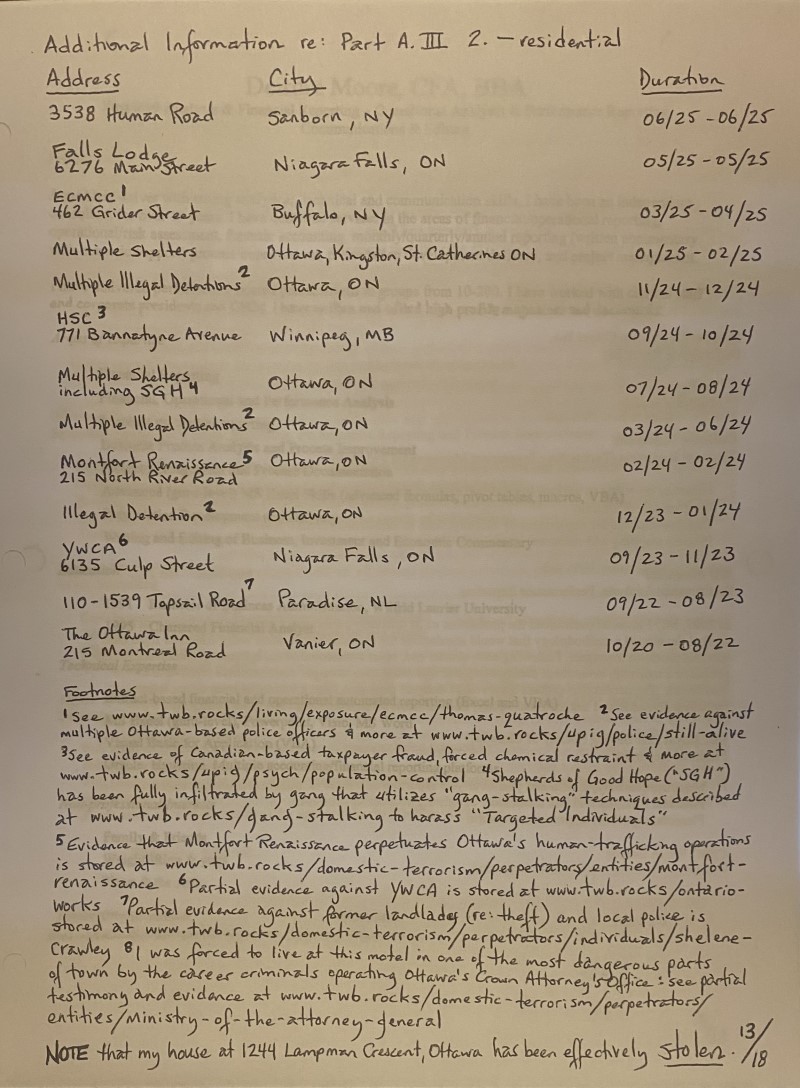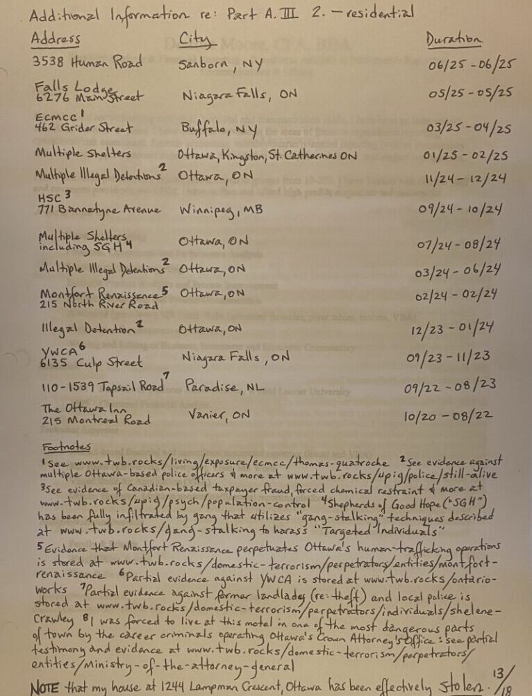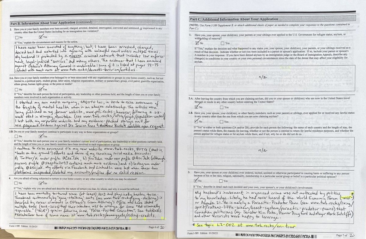 Submitting a complete application is not an easy task as I am a Targeted Individual (“TI”) who is swarmed and/or threatened continuously by gang-stalking cells (see primer on gang-stalking at https://twb.rocks/gang-stalking and some recent testimony and evidence at https://twb.rocks/hostiles). Well aware of this reality, my approach has been to begin submitting my U.S. Asylum Application on a “best-efforts” basis in advance of the 12-month deadline (ie. May 5, 2027). Versions that have been filed to date are: