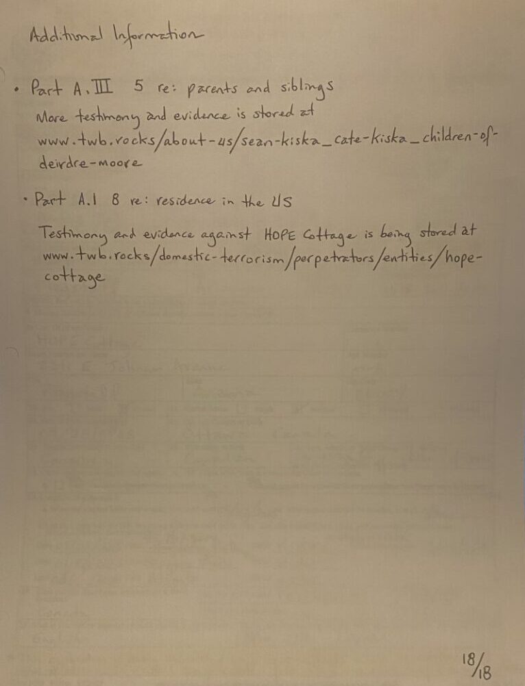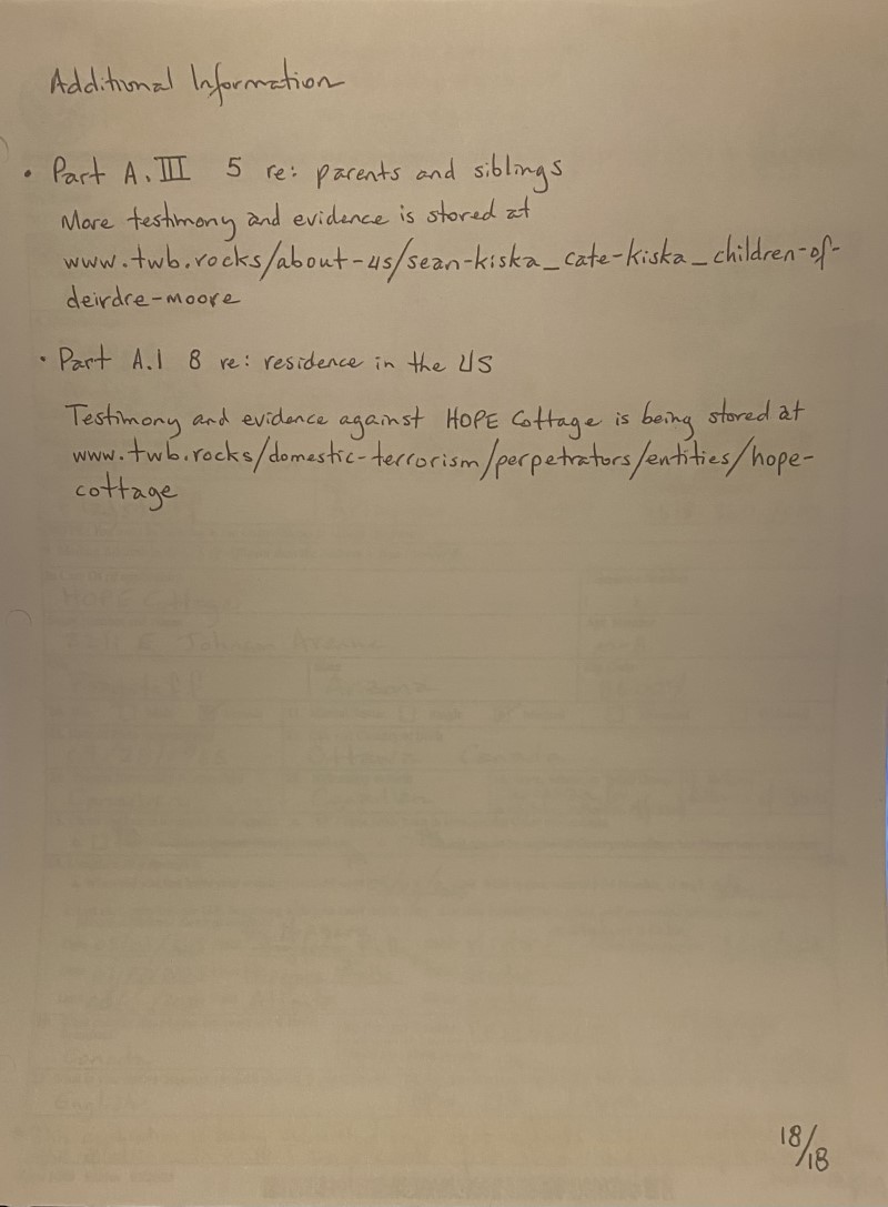 - To Tustin, California #1 couriered on 20260305 was my first draft. Pages 2-8 were left blank; but, page 12 included five links to evidence and testimony (see image 1). This was the best that I could do following harassment and threats at fully-infiltrated shelter, HOPE Cottage (https://twb.rocks/domestic-terrorism/perpetrators/entities/hope-cottage).
